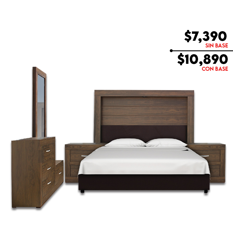 Cabecera King Size ó Matrimonial, 2 Buros, 1 Cajonera, 1 Base para espejo, 1 Espejo.